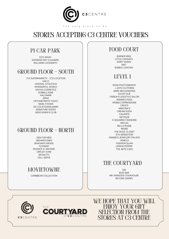 Gift vouchers are available for purchase at the C3 Centre Mall Office, located on Level 1. C3 Centre gift vouchers that can be redeemed at a number of stores throughout the centre.
